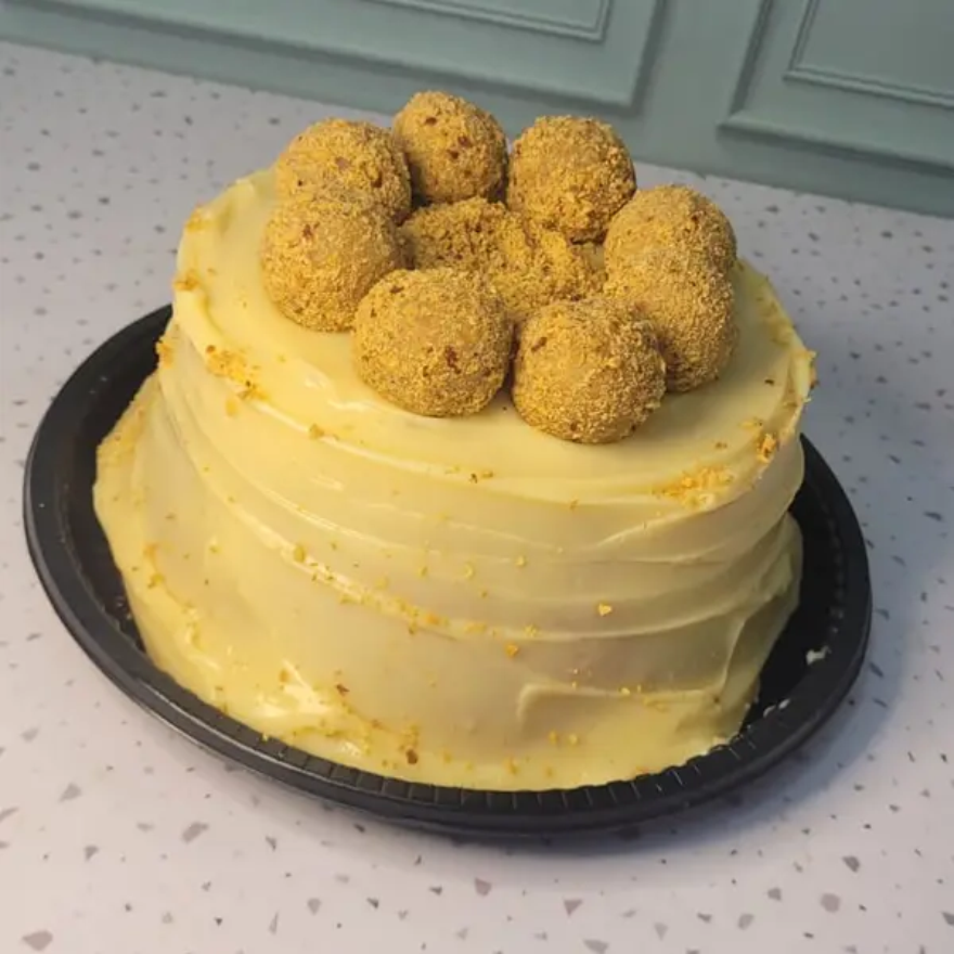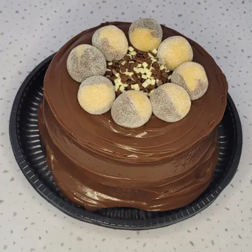 Massa Branca, Recheio Vulcão Amendoim, Cobertura 4 Leites, Finalizado com Brigadeiros de Amendoim.