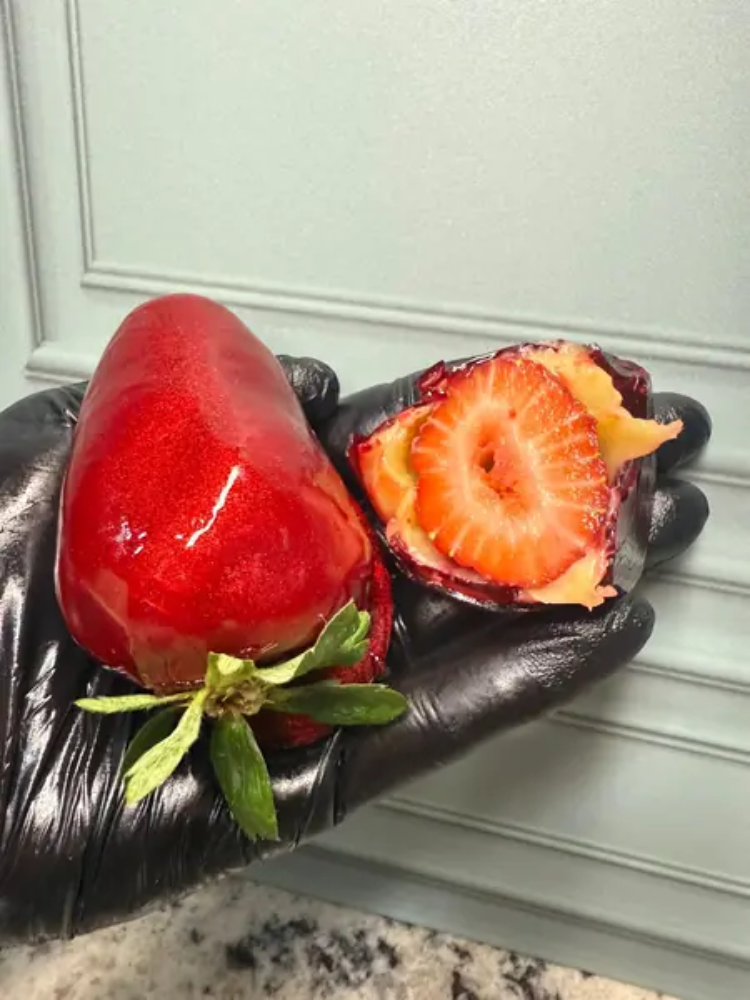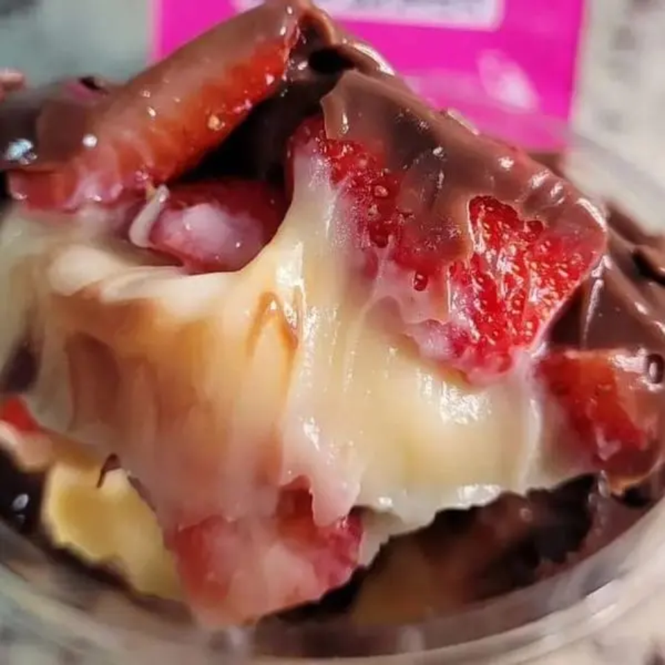 UMA EXPLOSÃO DE SABOR QUE É SUCESSO DO MOMENTO MORANGO ENVOLVIDO NO BRIGADEIRO BRANCO COBERTO COM UMA COBERTURA VERMELHA BEM CROCANTE