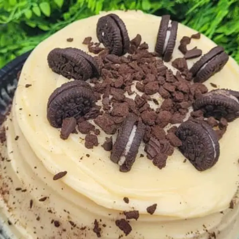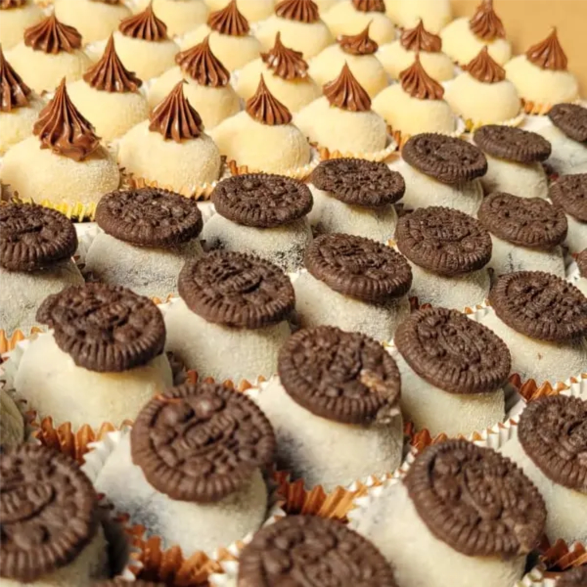 Massa branca, recheio vulcão de óreo com cobertura 4 leites, finalizado com óreo.