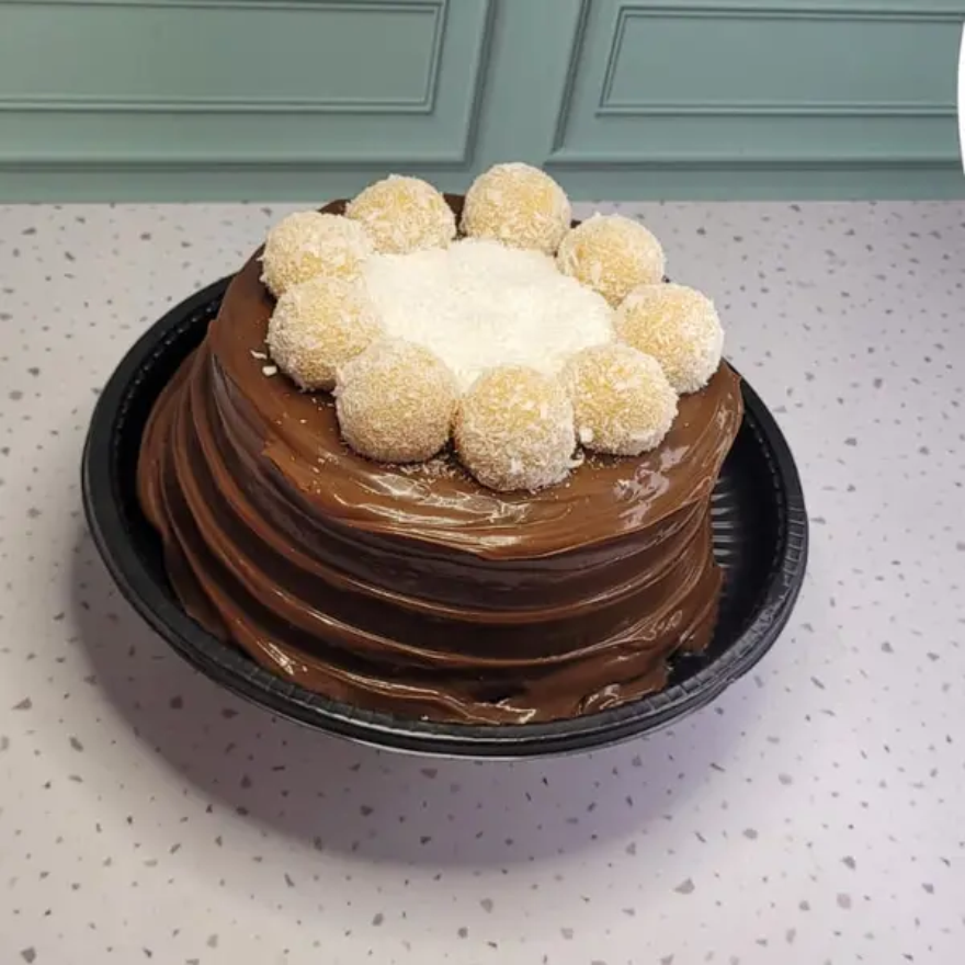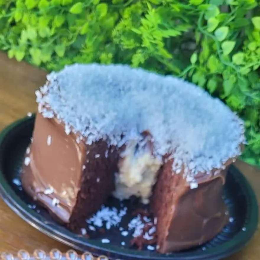 Massa de Chocolate , Recheio Vulcão de Coco, Cobertura de Brigadeiro Gourmet, Finalizado com Coco.