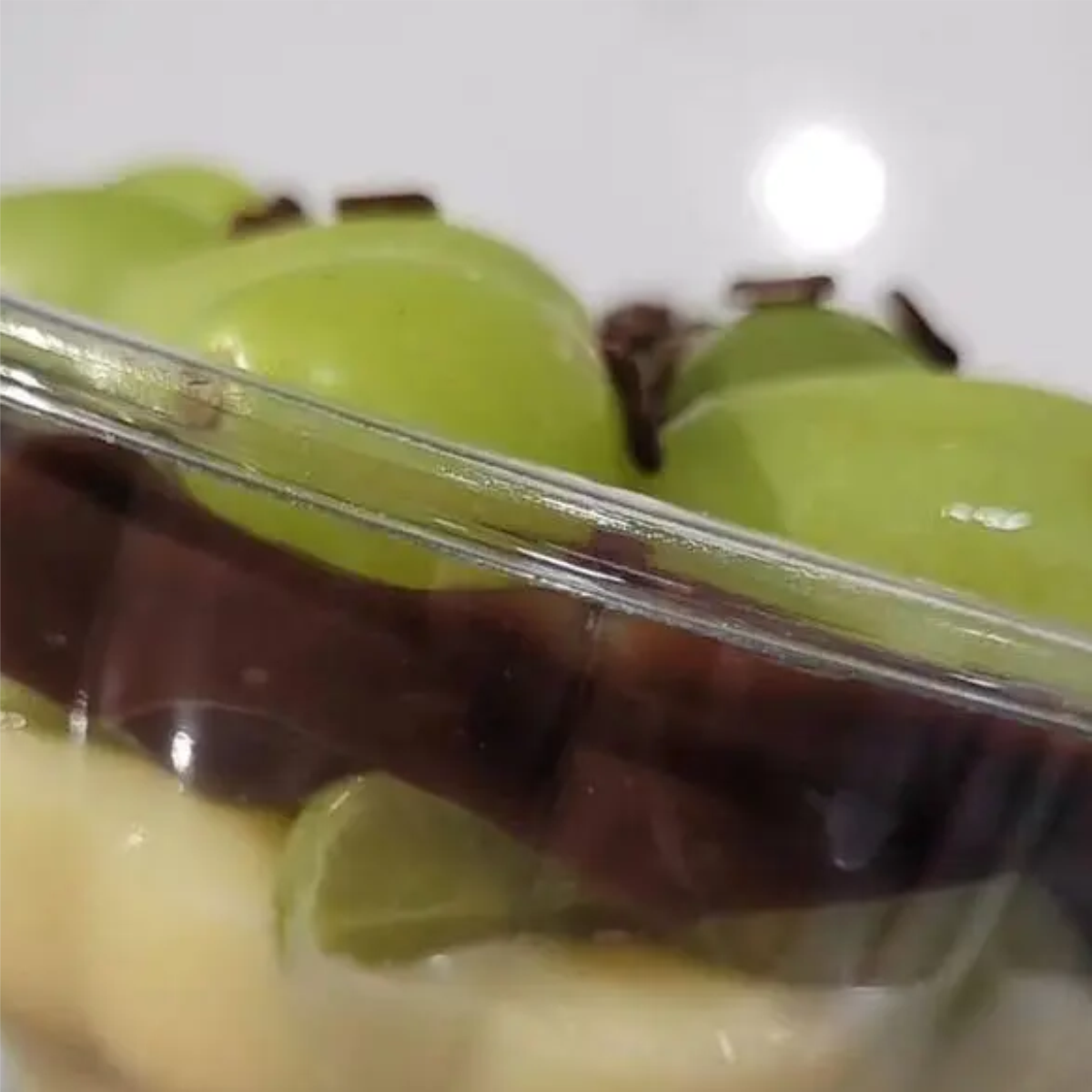 Brigadeiro Branco, Camada Generosa de Uva Fresca, Brigadeiro ao Leite, Finalizado com Granulle ao Leite.