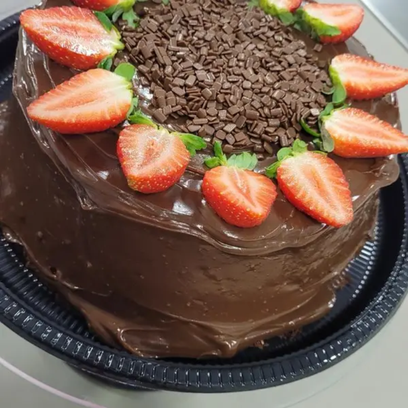 Massa de Chocolate, Recheio Vulcão de Geleia de Morango Caseira com Cobertura de Brigadeiro Gourmet, Finalizado com Morango Fresco e Granulle ao Leite.