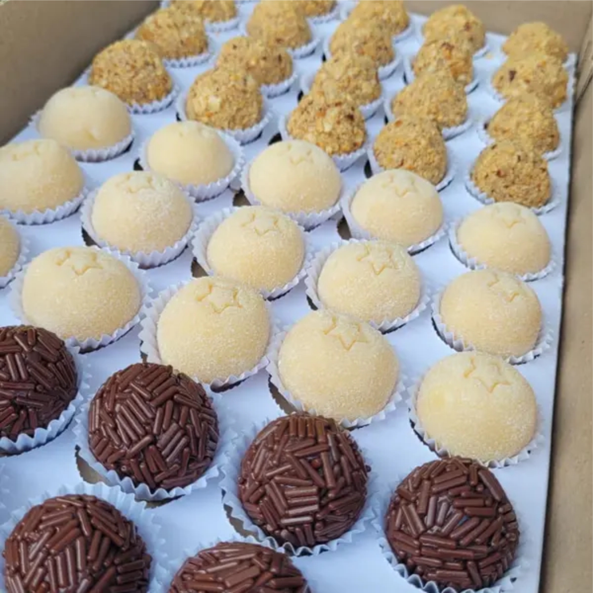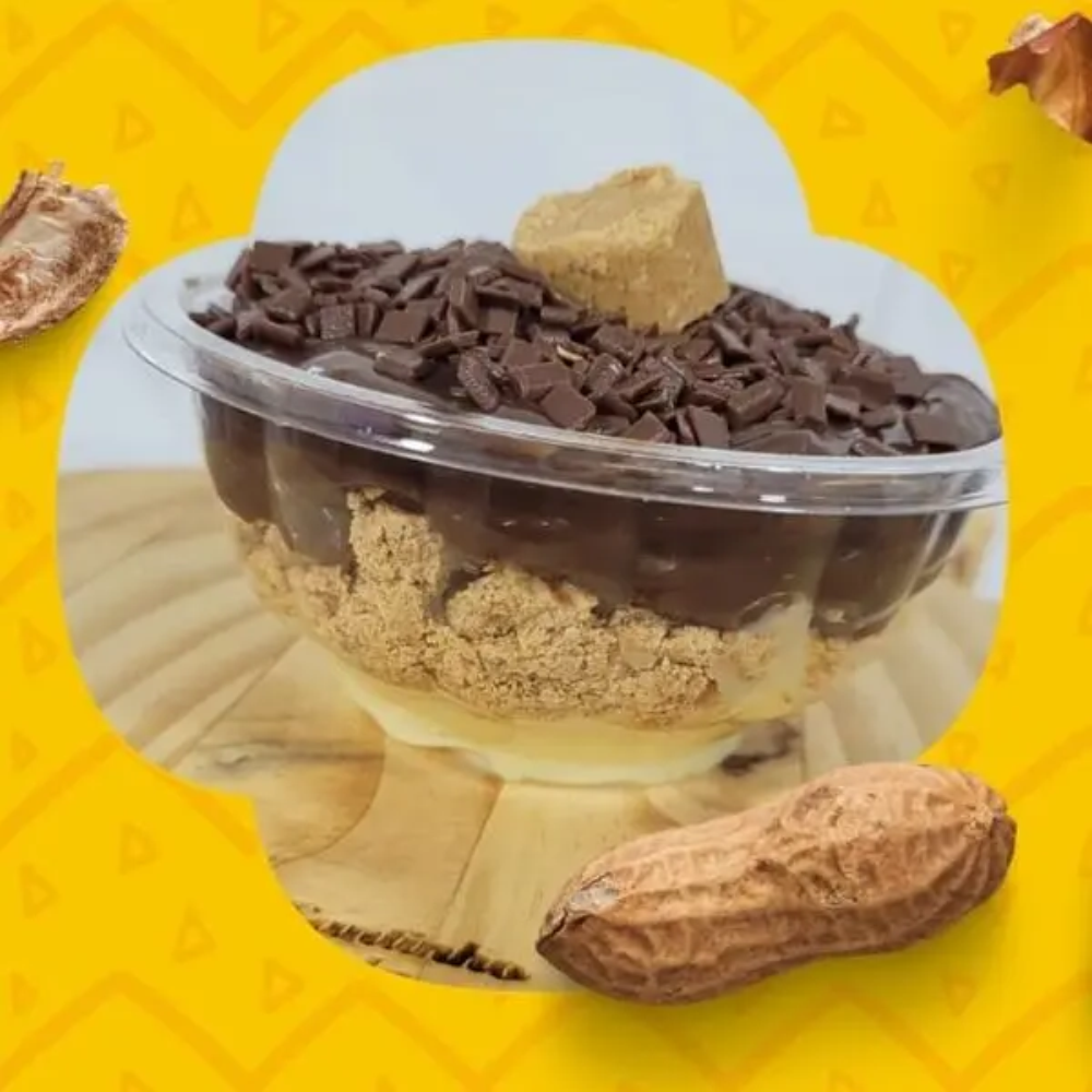 Brigadeiro Branco, Camada Generosa de Paçoca, Brigadeiro ao Leite, Finalizado com Granulle ao Leite.