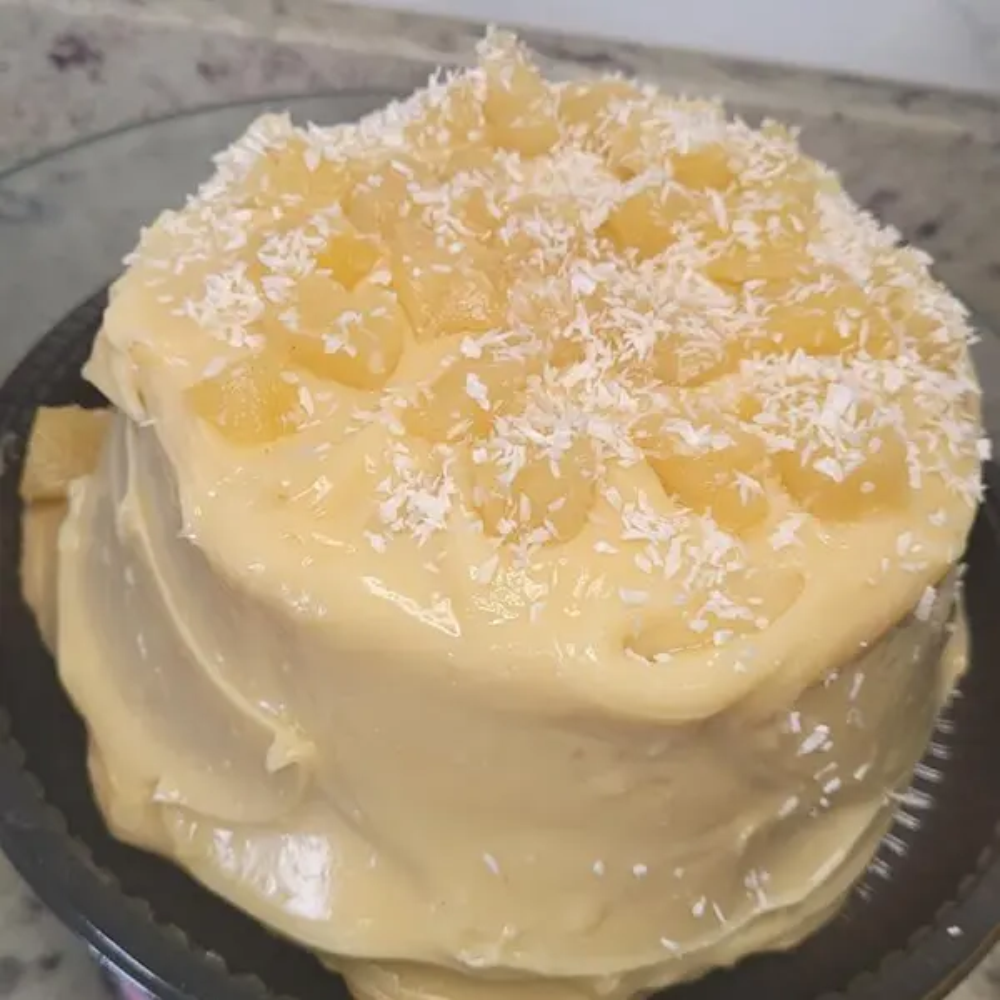 Massa branca. Recheio (vulcão) abacaxi + coco cobertura de chocolate branco pedacinhos de abacaxi e coco ralado por cima.
