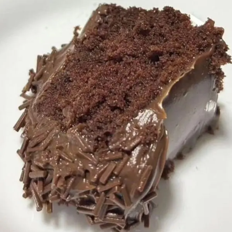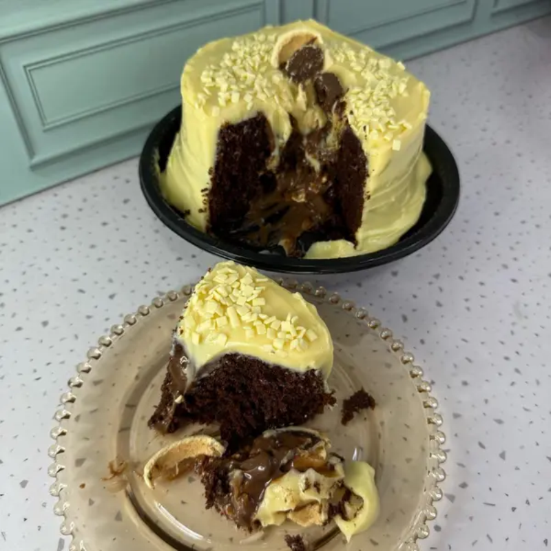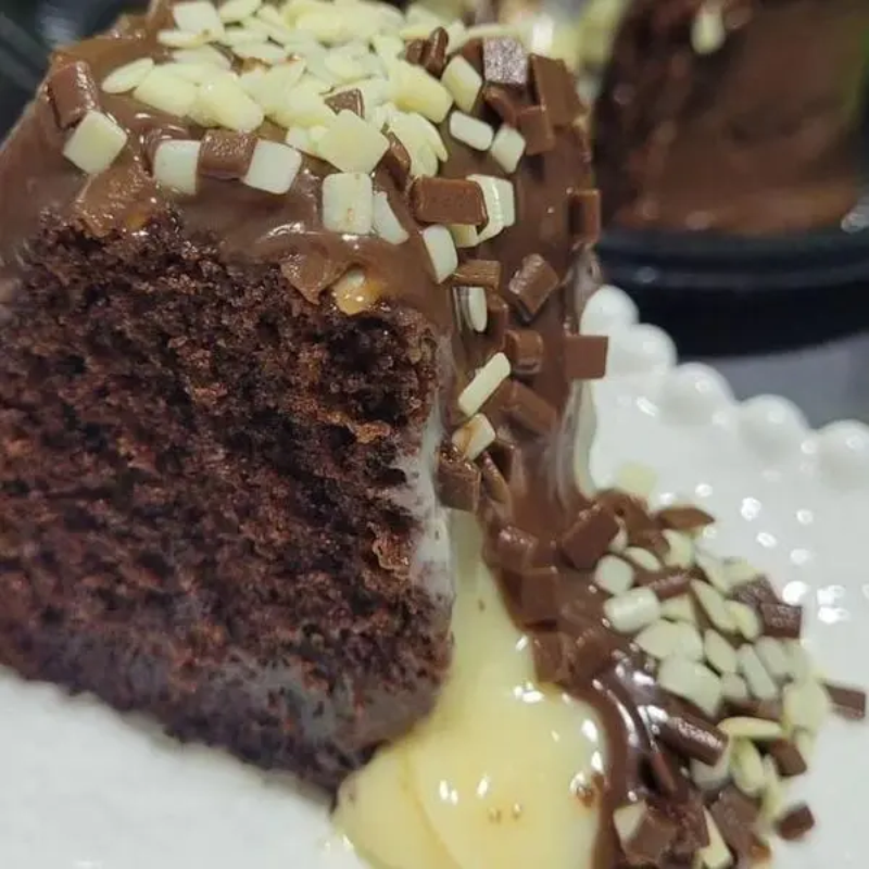 Massa chocolate, recheio vulcão de brigadeiro ao leite com pedaços de ouro branco