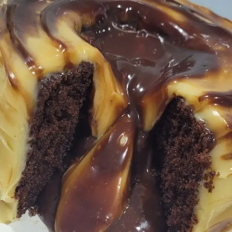 Massa de chocolate, recheio vulcão de nutella, cobertura brigadeiro de ninho, finalizado com nutella.