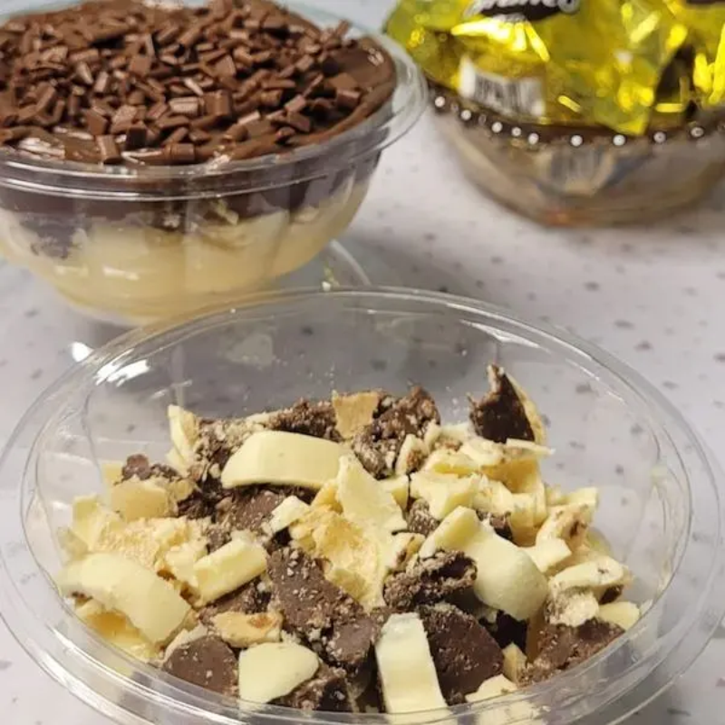 Brigadeiro Branco, Camada Generosa de Ouro Branco, Brigadeiro ao Leite, Finalizado com Granulle ao Leite.