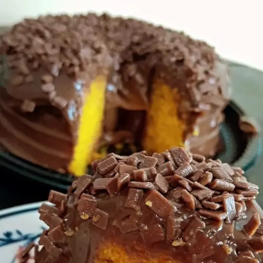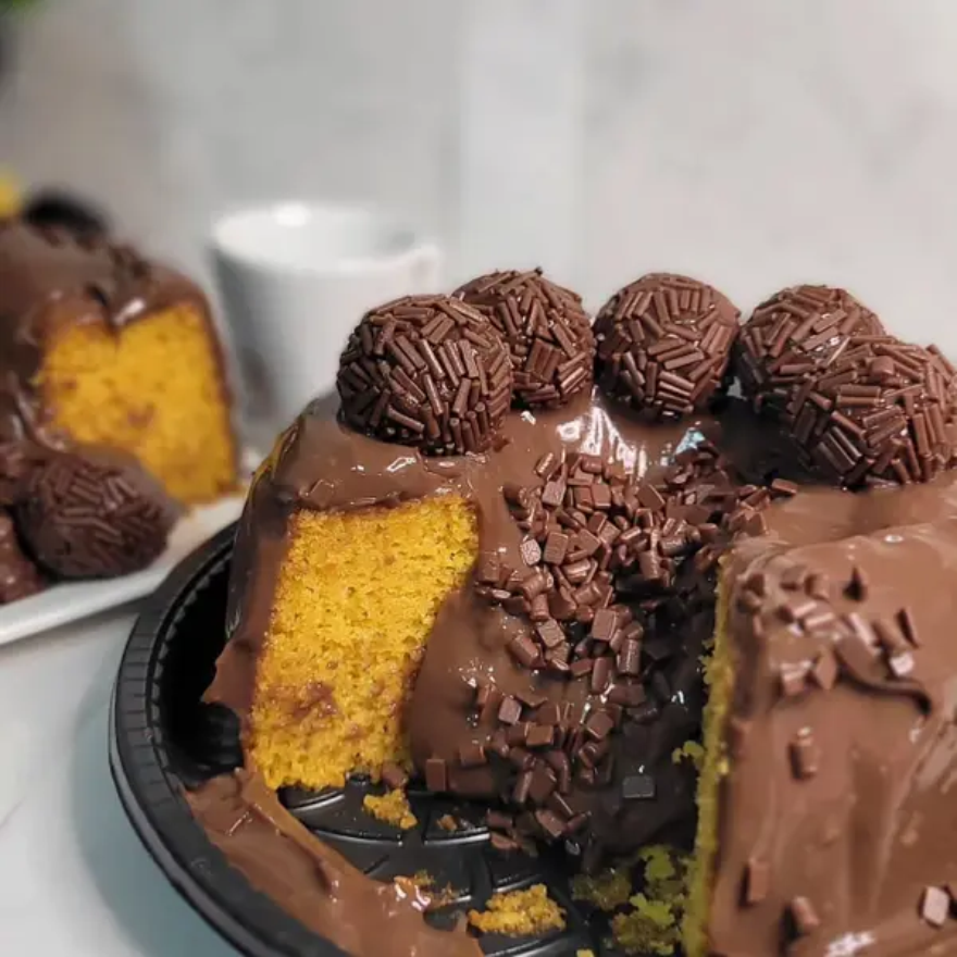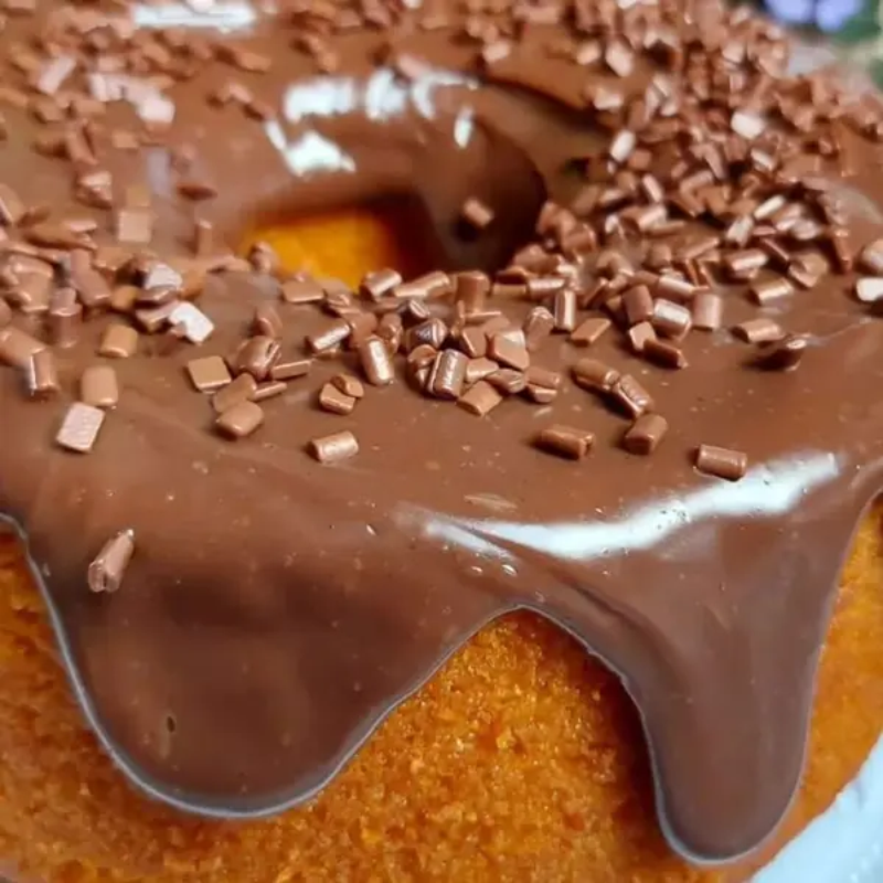 Massa de Cenoura com Cobertura de Brigadeiro Gourmet Preto, Finalizado com Granulle.