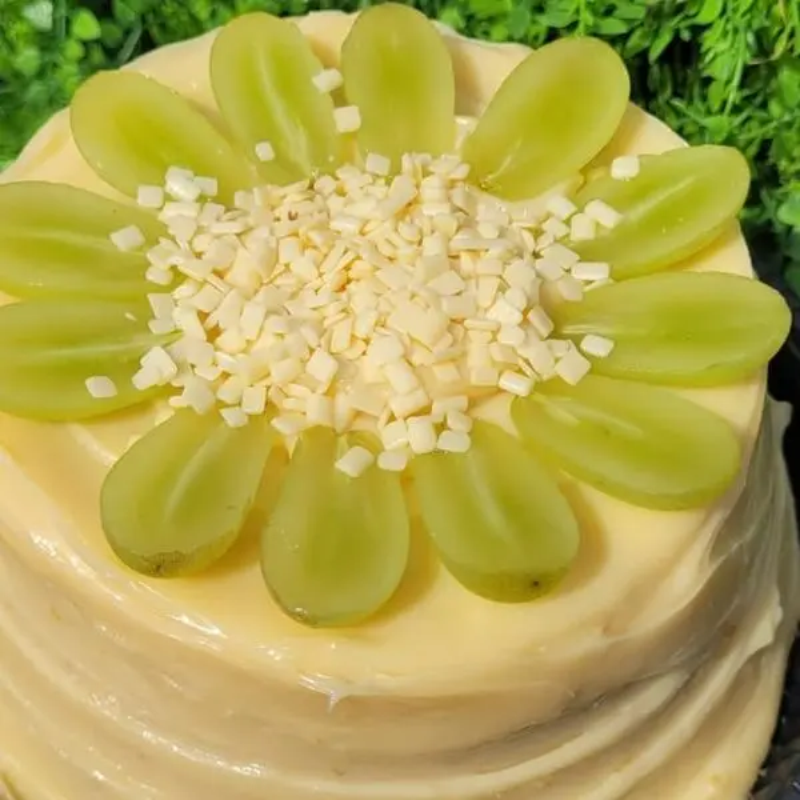 Massa branca, recheio vulcão de uva com cobertura 4 leites, finalizado com uva e granulle branco.