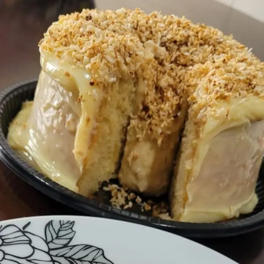 Massa Branca, Recheio Vulcão de Coco Queimado, Cobertura 4 Leites, Finalizado com Coco Queimado.