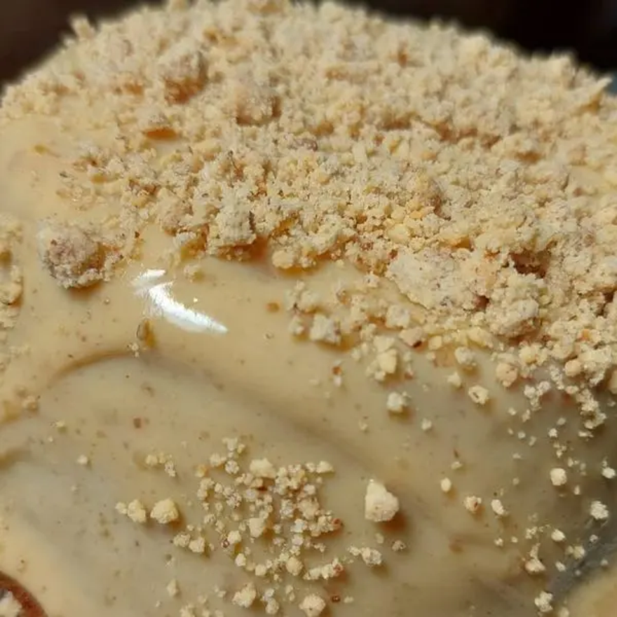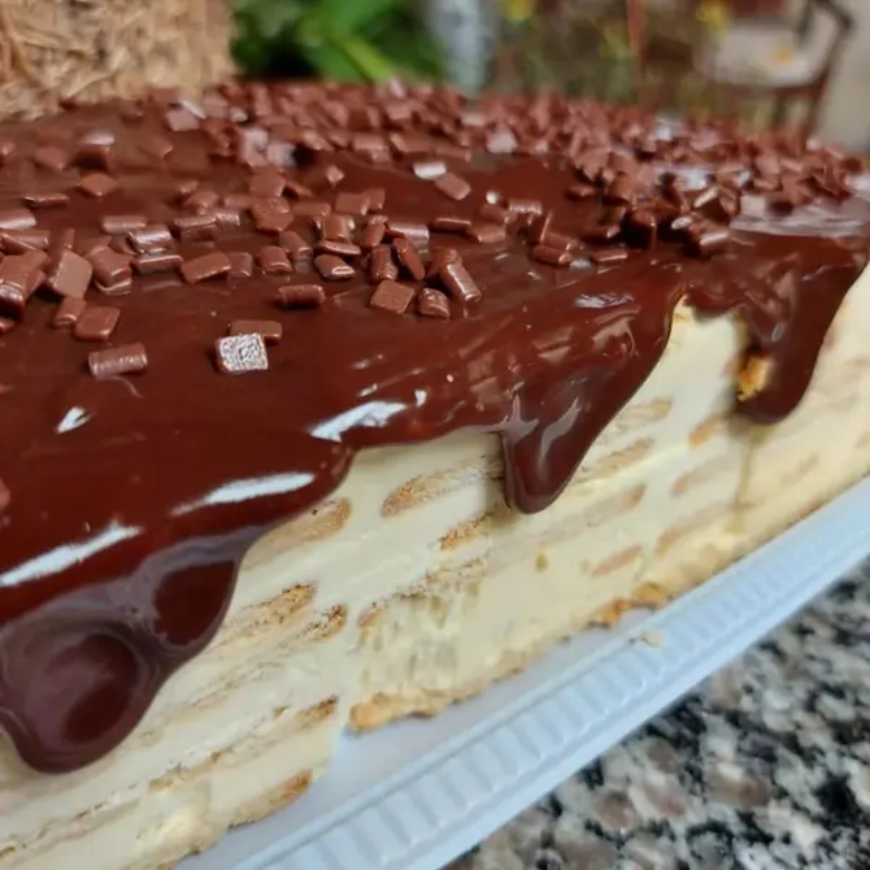TORTA DE CREME DE NATA COM CAMADAS DE BOLACHA, FINALIZADA COM GANACHE E GRANULLE AO LEITE.