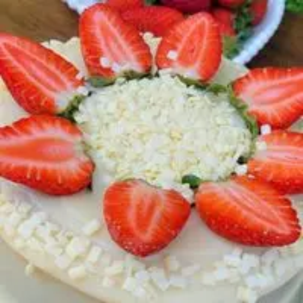Massa Branca, Recheio Vulcão de Geleia de Morango Caseira com Cobertura de Brigadeiro 4 Leites, Finalizado com Morango Fresco e Granulle Branco.