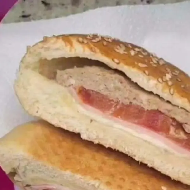 Uma Deliciosa Massa Assada Recheada com Hamburguer, Tomate, Queijo, Presunto, Catupiry, Finalizado com Orégano.